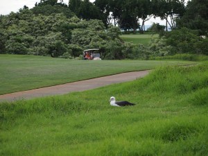 The following season, 2006-2007, Mrs. PB had a traumatic experience. On December 6th I received a call that a gardener had seen a “big white bird” in a fenced off yard. It was Mrs. PB. I carried her out to a nearby empty lot and she immediately flew away. Mr. PB had returned to Princeville on November 11th, and Mrs. PB probably would have joined him within the next week if she had not been trapped. He was gone by the time she was freed. Mr. and Mrs. PB did not nest that year, and when I saw them sitting a few feet away from each other later in the season they were not engaged in any of the “quiet contact” behaviors nesting couples normally engage in. They looked like two albatrosses who had never met before.