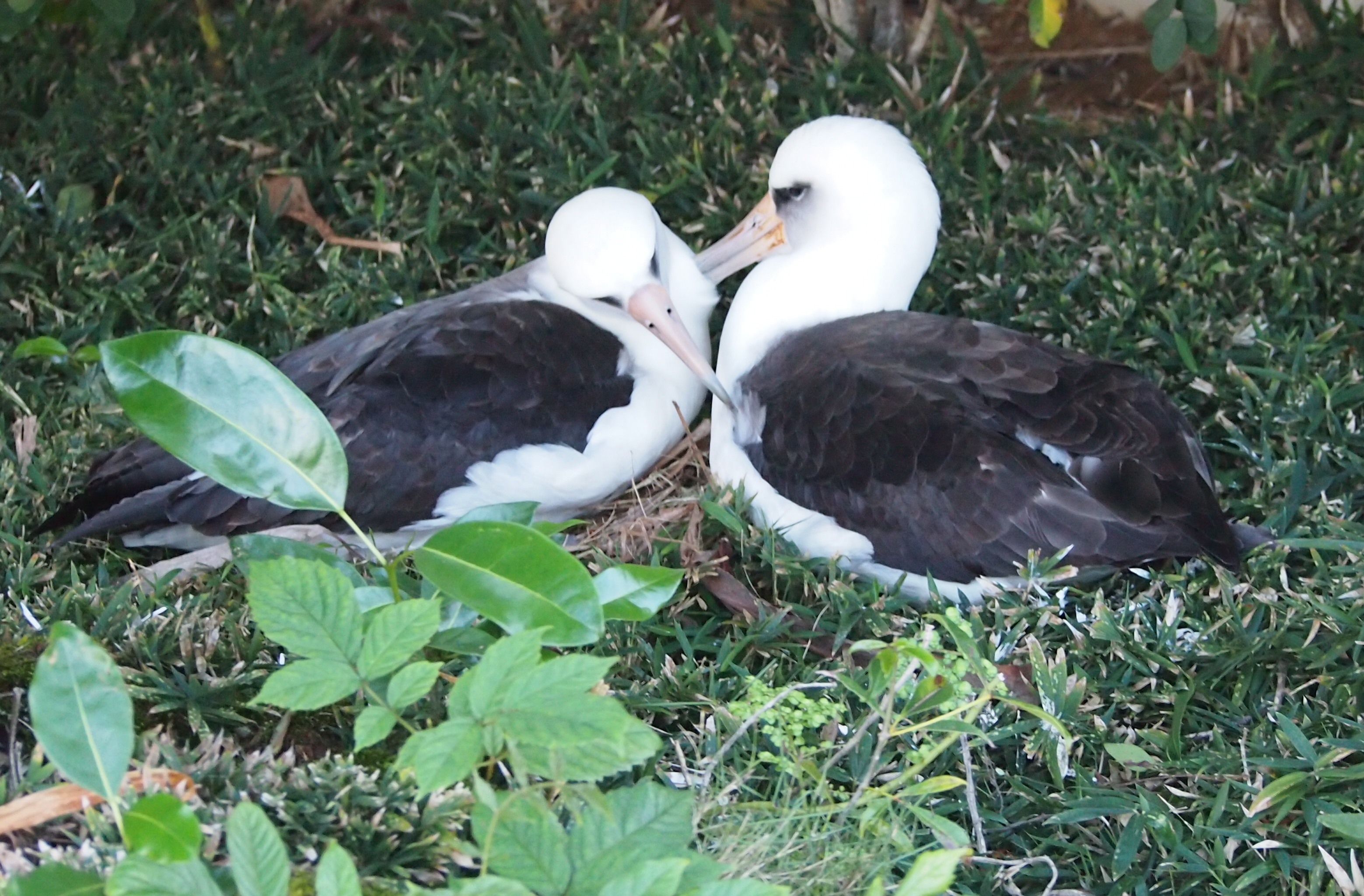 I expected to find KP470 on the nest when I checked it on Saturday, but I was wrong.  KP735 was alone, still sitting on the egg.  KP470 is learning proper albatross etiquette from her new mate.  This is not a trivial lesson.  When the parents start leaving the chick alone, they will be spending all of their time finding food for themselves and for their progeny.  They will not have time to lollygag at the nest.  KP470’s job right now is to fly out over the ocean and spend enough time there to replenish the nutrients she lost during all those days she spent on the nest.  Once the chick has hatched, she will need all of her strength to fulfill her job as an albatross parent.