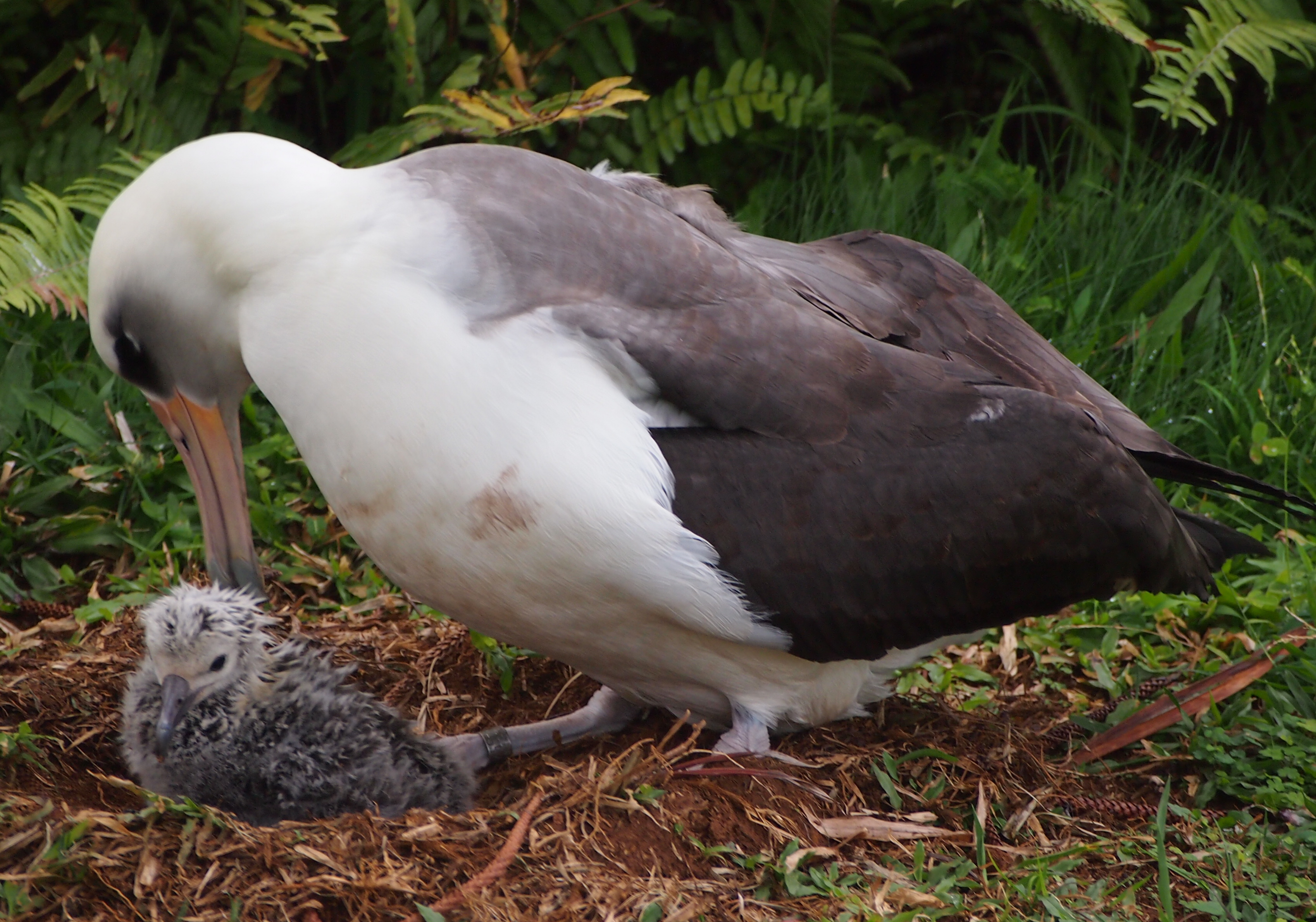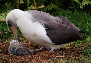 The father then followed the typical pattern of albatross parents, gradually spending more and more time away from the chick.  During all of this time he fed his baby with no help from a mate.  Raising a chick is a difficult job for two parents, and an almost impossible task for one.  He had to work twice as hard as other albatrosses but the chick seemed to be thriving under this care.