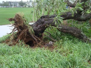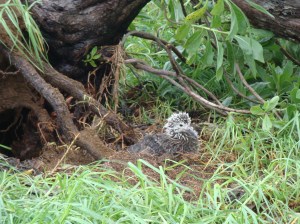 There is a beach heliotrope tree on the golf course that albatrosses have chosen as a nest site through the years. This year, a couple who first nested there two years ago built their nest under that tree and have a healthy chick residing in it. During the storms that hit Hawaii between Saturday and Tuesday, the tree was uprooted and fell over. The nest was in the perfect spot and the chick survived with every feather in place.
