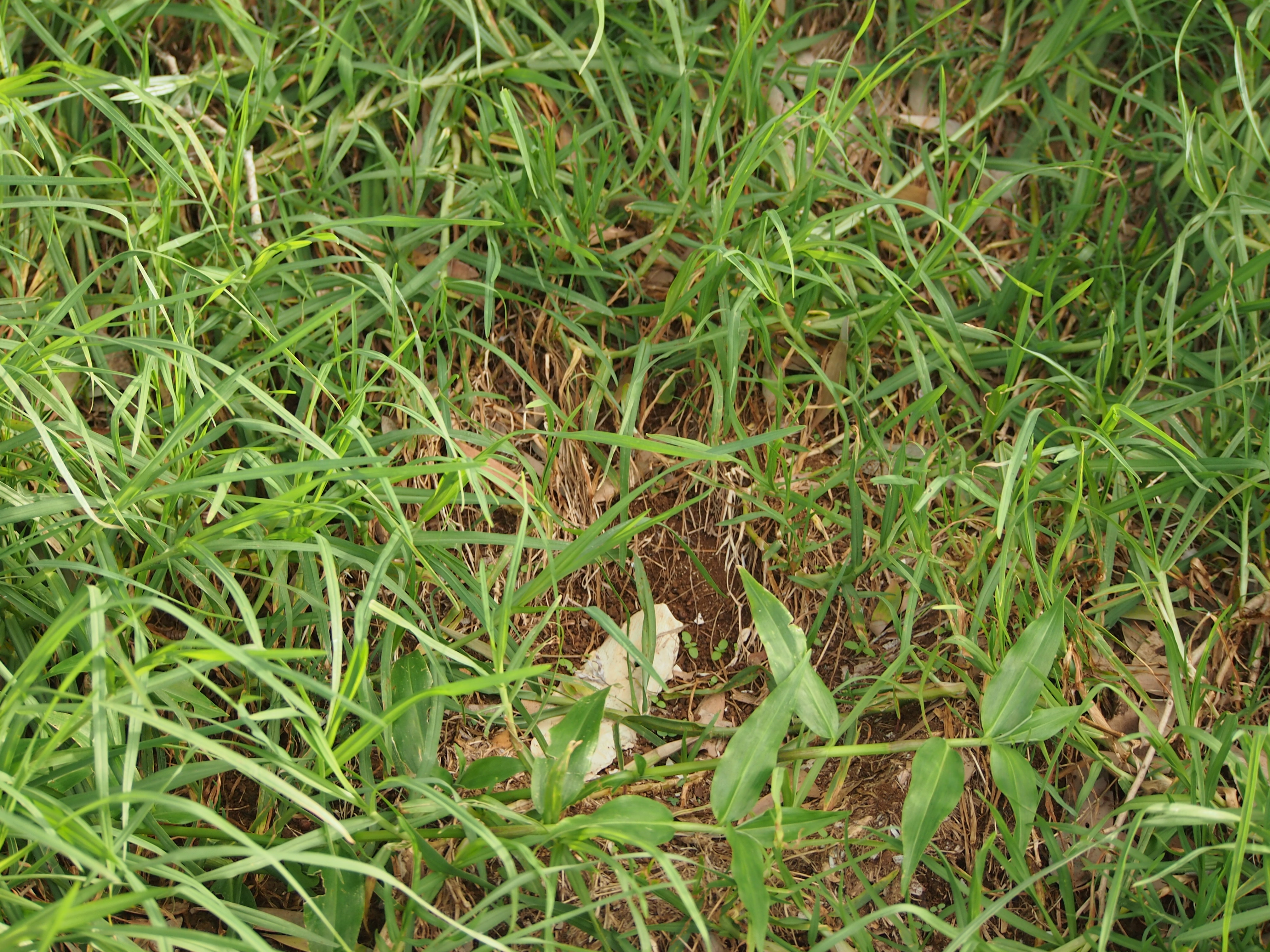 The other chick was actually building a nest around him, by moving twigs and leaves around his body and by kicking out an indentation in the ground with his feet. He now resides in his new nest full time. You can see him in the photo following the film clip.