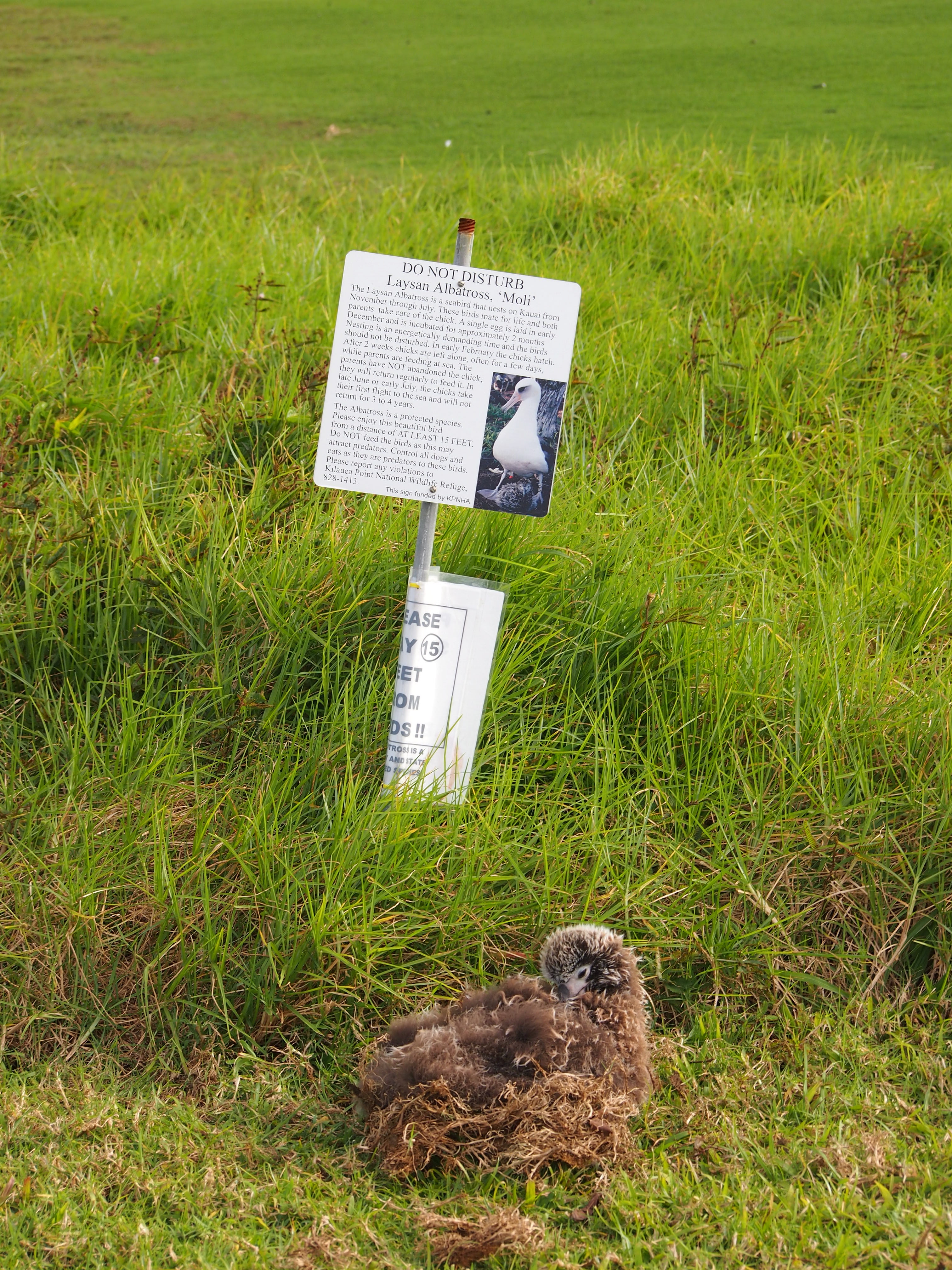 This chick on the golf course moved away from the original nest that was further away from the albatross sign. I guess he wanted people to be able to read his sign while checking him out. I recently had someone ask me if “that brown bird” was a penguin, so maybe the chick had the right idea.