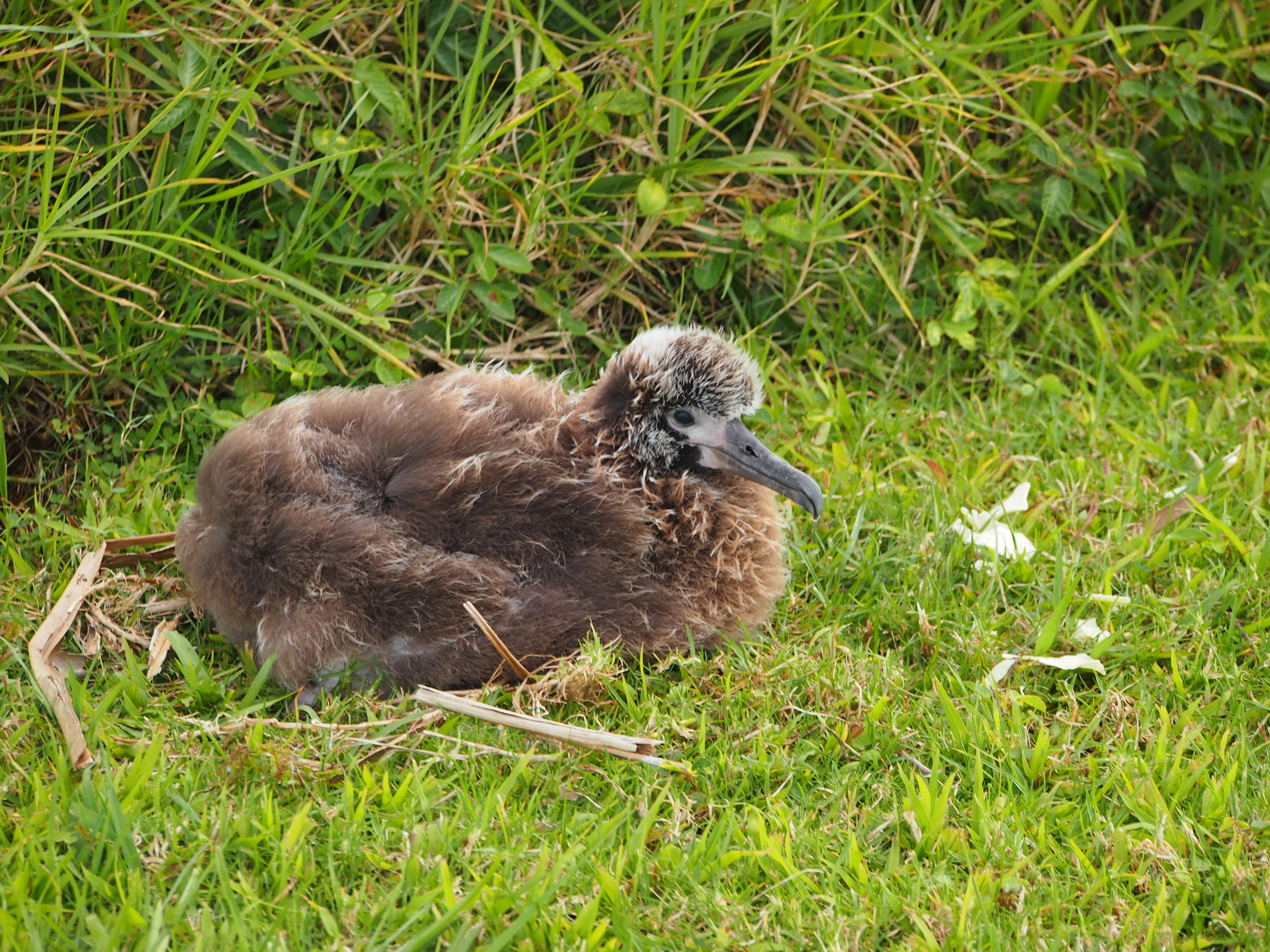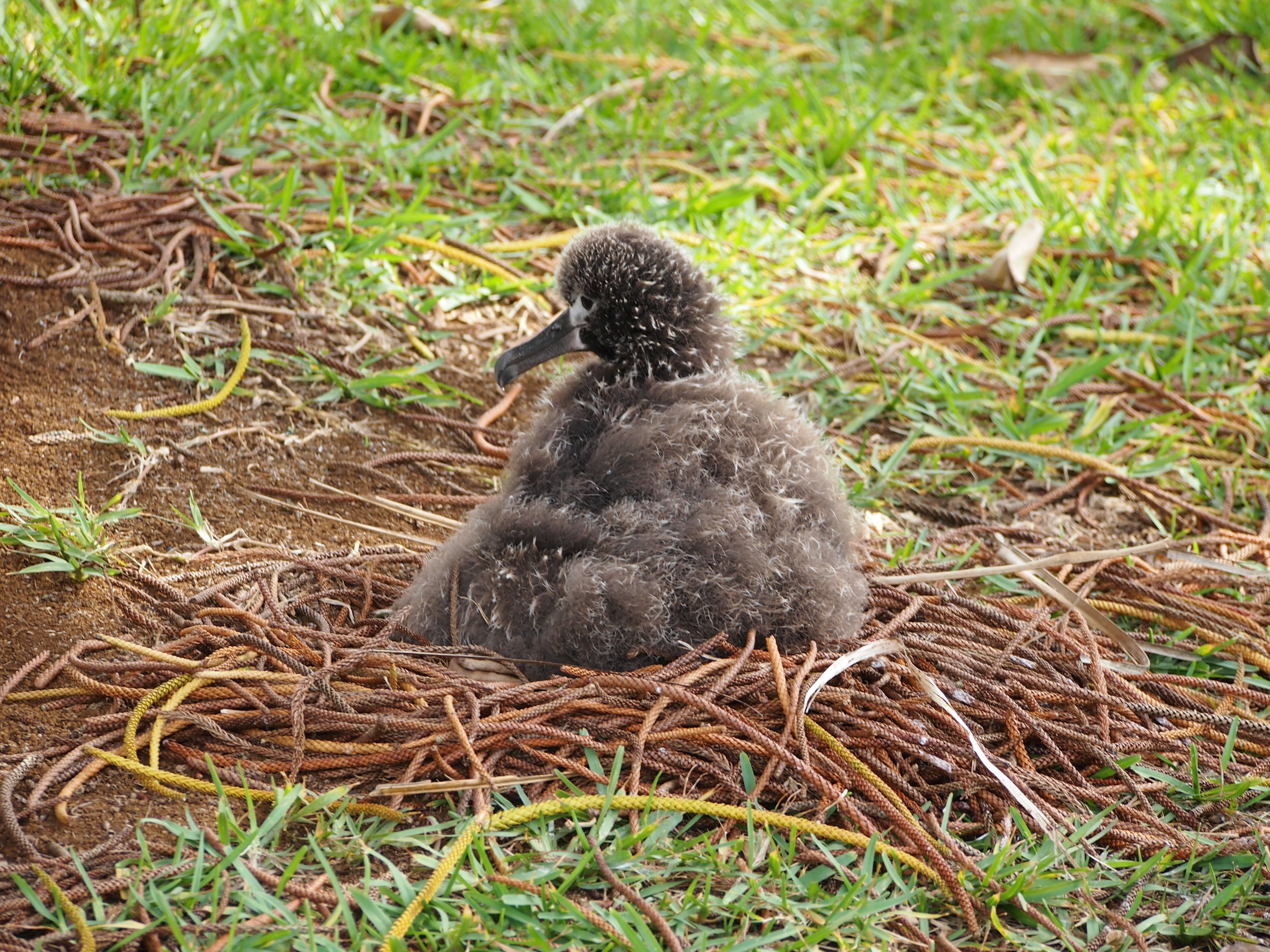 The youngest chick has not left his parents’ nest yet, but he has been adding little architectural flourishes. He pulled hala (pandanus) leaves close to himself. I love seeing an albatross use a native plant to complete his nest.