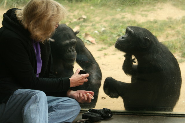 This is a photo my friend took last year when I visited the chimps. The one on the right is Jean, Gracie’s daughter. Gracie is now in her early twenties. Jean always comes over to sit by me when I am at the exhibit. Zoe is the other chimp, and she is looking at her reflection in my mirror. They are both pretty young ladies, teenagers as of this year. I remember them as babies, just as I remember seeing Gracie for the first time with her mother, Pandora. Gracie had another daughter this year; I am looking forward to seeing the two of them. And I will sit with Jean, and whoever else might join her. I don’t need to say anything to Jean, she seems to just enjoy my company.