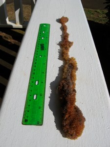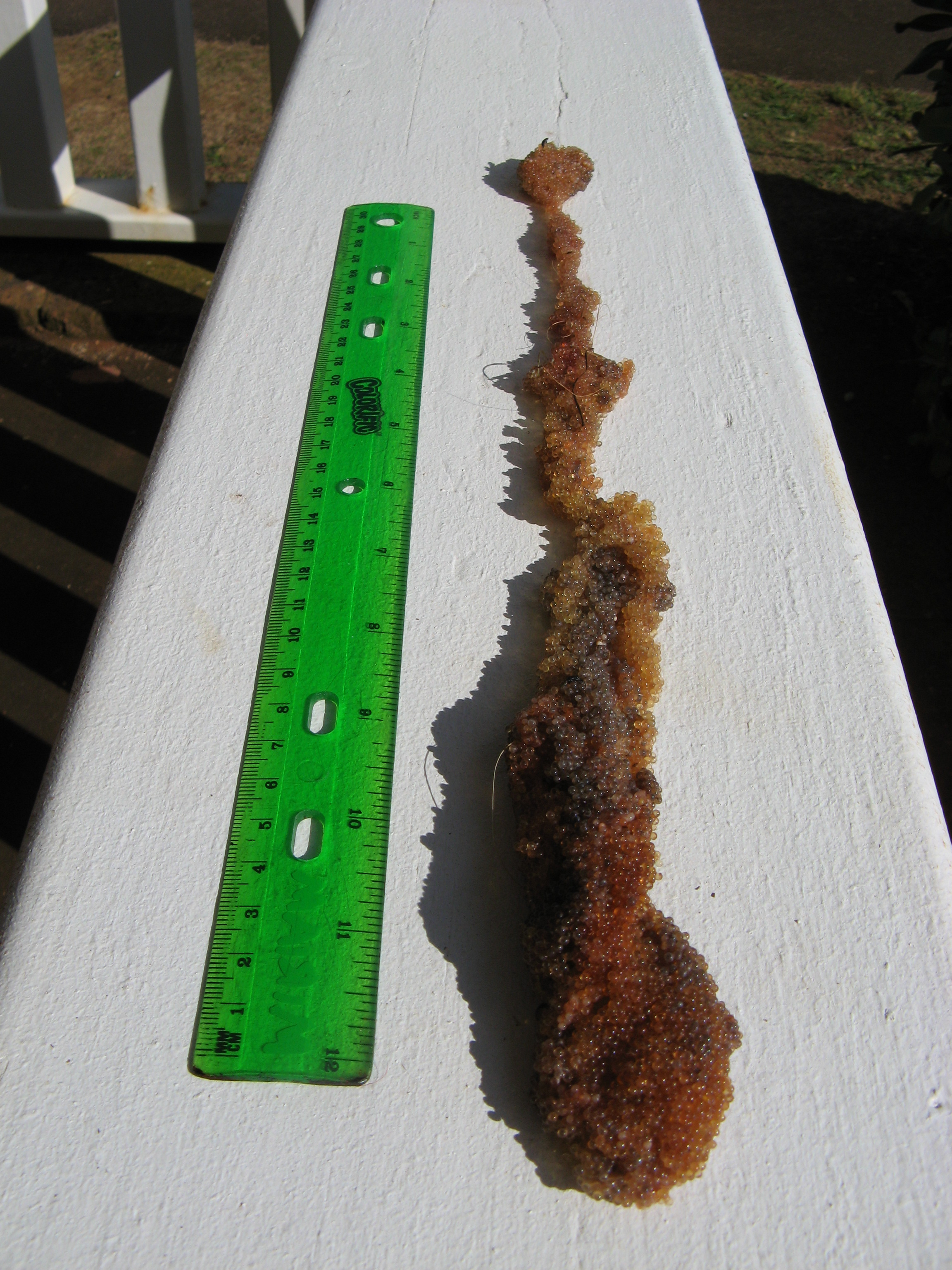 My sister Cindy and I once found a chick who appeared to be choking. There was a bit of plastic fishing line sticking out of his mouth. It is always possible for a hook to be attached to this line, so we would never just yank on it, but the line came out easily. Here is a photograph of it:
