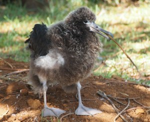If you check my June 17th entry, you will see a film of a chick trying his wings. His nest was on an empty lot overlooking the Prince golf course, and the last time I saw him he was sitting halfway down the part of the property that sloped down towards the course. When I checked for him on June 23rd he was gone. There have been constant strong ocean breezes off of that golf course, so I would bet he caught one. He may have stopped along the way, then picked it up again. There is an ocean bluff at the end of the golf course. It is very important for chicks whose nests are on land quite a bit above sea level (not on a small, flattish island surrounded by ocean, like Midway) to have the uplift provided by a cliff, and to be able to see the ocean from there. They cannot fly high enough to fly all the way from an inland area and would be put in harm’s way if they had to somehow find the ocean while making short, low flights.