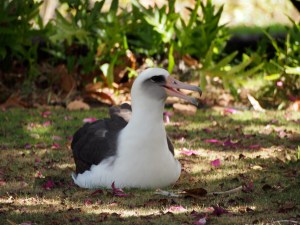 Yesterday my friends Allan and Julie, visiting from California, spotted 3 birds next to the golf course. Unfortunately, one disappeared before I arrived, but that one may be half of a couple who always nest behind some homes next to the golf course. I know these two albatrosses as the Tuna Bird couple because someone once left one of them a tin of tuna fish. People who leave food or water for the birds believe they are helping them, so if I leave a note telling them that the food could attract predators to the birds, they always stop. We also have Pastry Bird, Ham and Cheese Bird, Stinky Fish Bird, Fritos Bird, Hamburger Bun Bird and Fried Rice Bird.