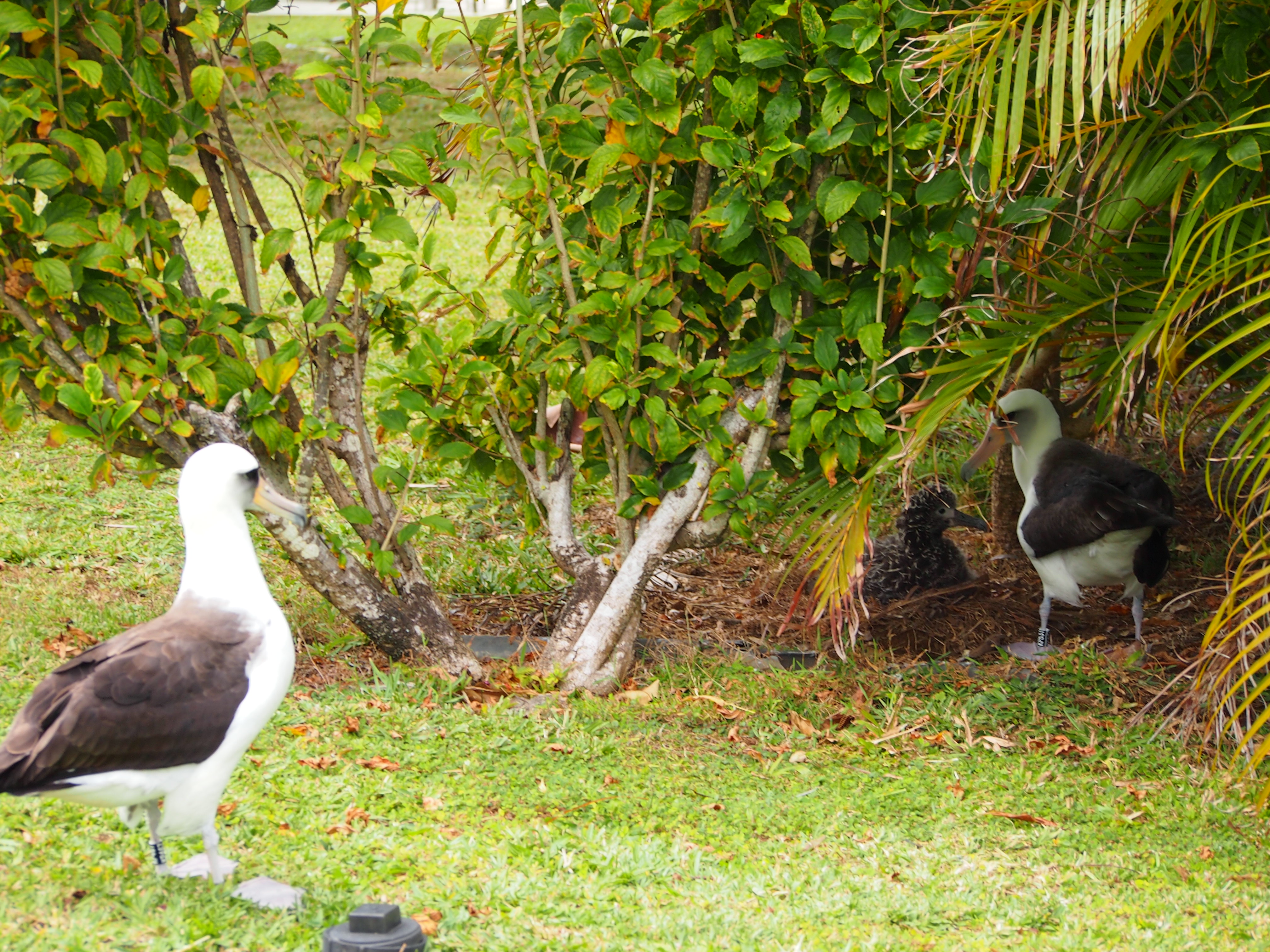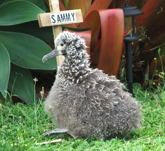 In Princeville we have trained all of the albatross chicks to sit by signs with their names on them to make it easier to see what names homeowners have given to the chicks living in their yards.
