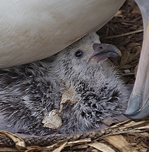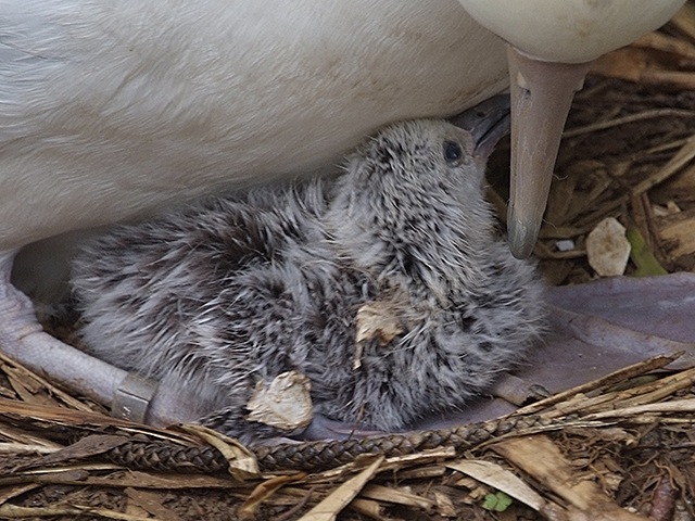 One of the rewards for the 3 or so hours a day I generally devote to the albatrosses is that I know the approximate day an egg will hatch.  It usually takes a chick 3 or 4 days of breaking and removing the shell before he makes his appearance.  During that time the parent will not help the chick but will talk to him and offer moral support.  The chick often responds.  It is one way they both learn to recognize each other.  That may not be a big problem in Princeville, where nests are spaced far apart.  On Midway, of course, being able to recognize your chick’s voice would be important for locating him amidst the hundreds of thousands of nests.