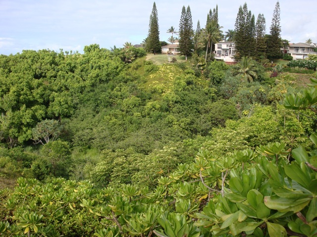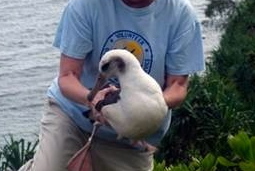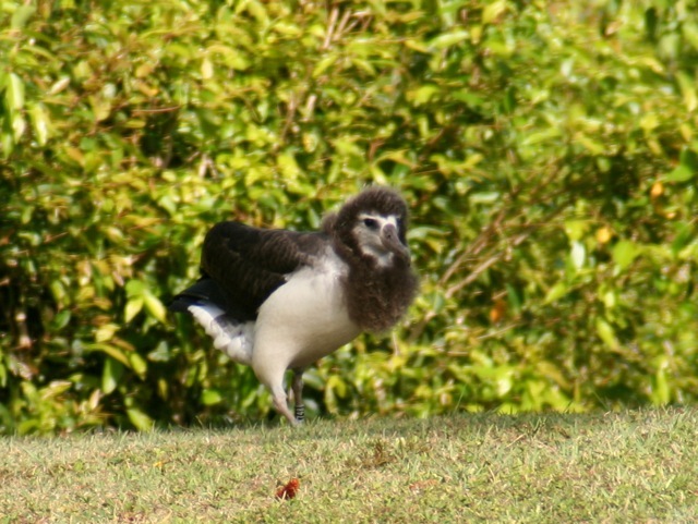 He went down into a canyon greenbelt between my road and the condos on the other side.  It was such thick vegetation, I was afraid that he would hurt himself trying to plow through, or get hopelessly lost. Two days later the vacationer called me.  She had seen an adult albatross at the condos across the way, and he seemed to be having difficulty trying to take off from the bluff.  He kept sliding down the hill.  She was afraid that he would slide all the way down the bluff. My friend and neighbor, Bob Waid, drove me over there.  Fortunately, the bird was not too far down the bluff, so I climbed down and grabbed him, then carried him up the hill. It was Niko!